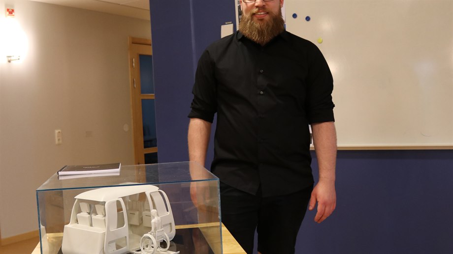 David Hilmarsson läser sista året på utbildningsprogrammet Industridesign vid Mittuniversitetet i Sundsvall. I sitt examensarbete har han jobbat med design för ett autonomt fordon med anpassade funktioner för rullstolsburna personer och byggt en prototyp för att illustrera detta.