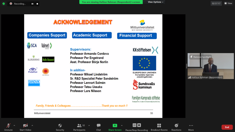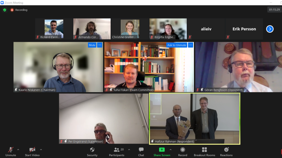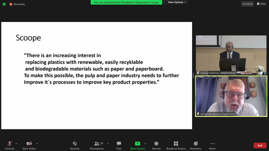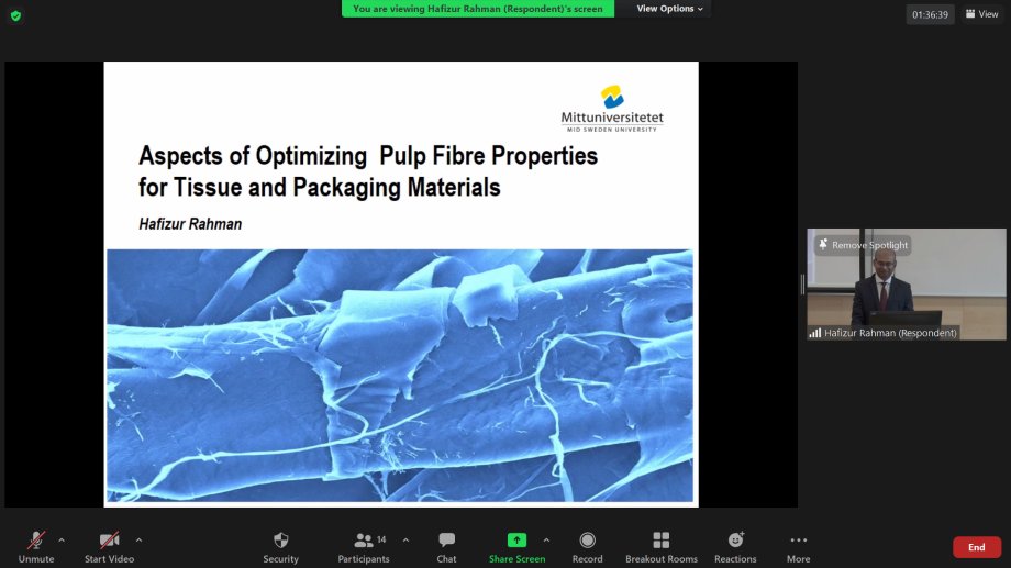 On June 14, 2021, Hafizur Rahman presented and defended his Doctoral Thesis in Chemical Engineering. The title of the thesis is: "Aspects of optimizing pulp fibre properties for tissue and packaging materials"