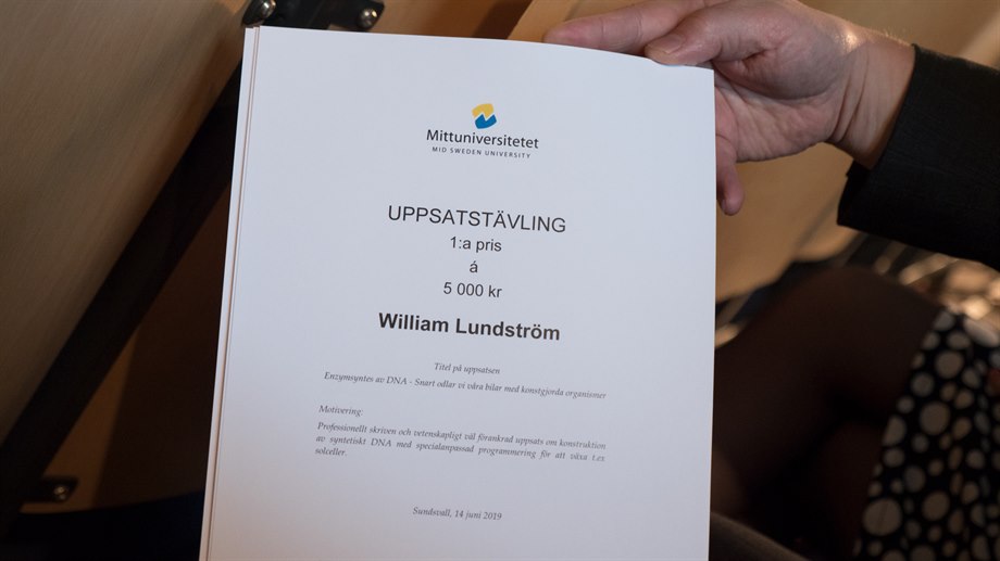 Under fredagens sommaravslutning på Sundsvalls Gymnasium Västermalm, presenterades vinnarna av årets uppsatstävling som arrangerats av Mittuniversitetet. Första pris, ett stipendium på 5 000 kr, gick till William Lundström med sin uppsats om ”Enzymsyntes av DNA - Snart odlar vi våra bilar med konstgjorda organismer”.