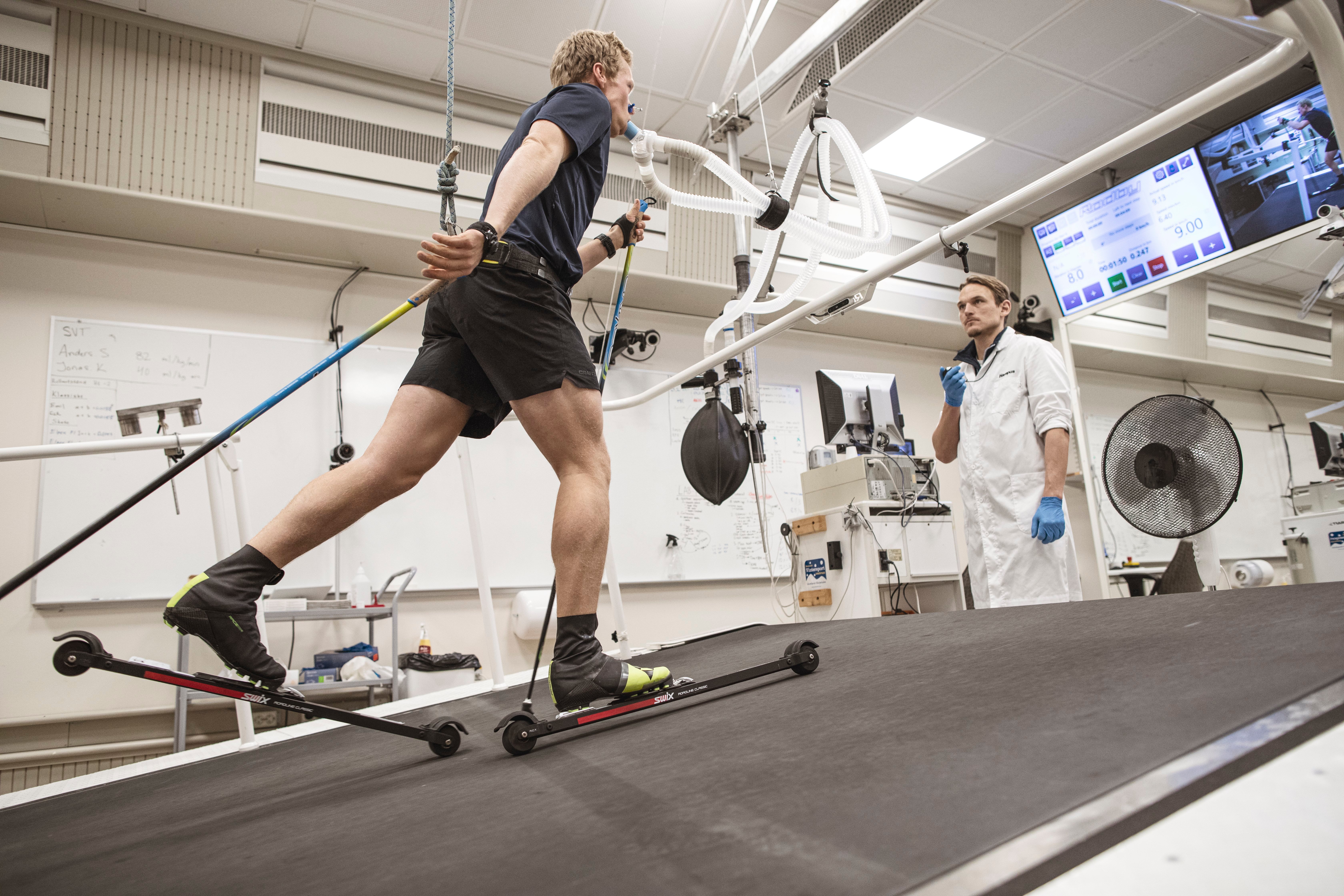 Alfred Buskqvist åker rullskidor på rullband med testutrustning som mäter syreupptagning, övervakas av testledare Hampus Lindblom.